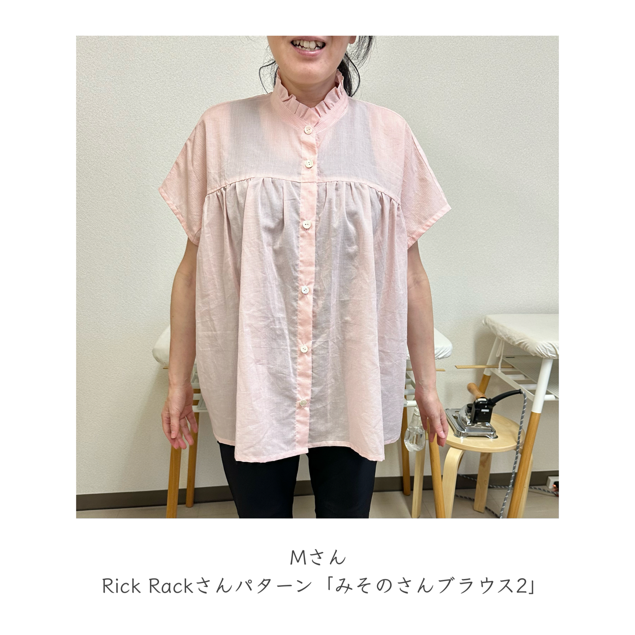 ご自身で用意されたRick Rackさんの型紙と生地を使って、襟元がフリルの軽やかなブラウスを完成されました👏