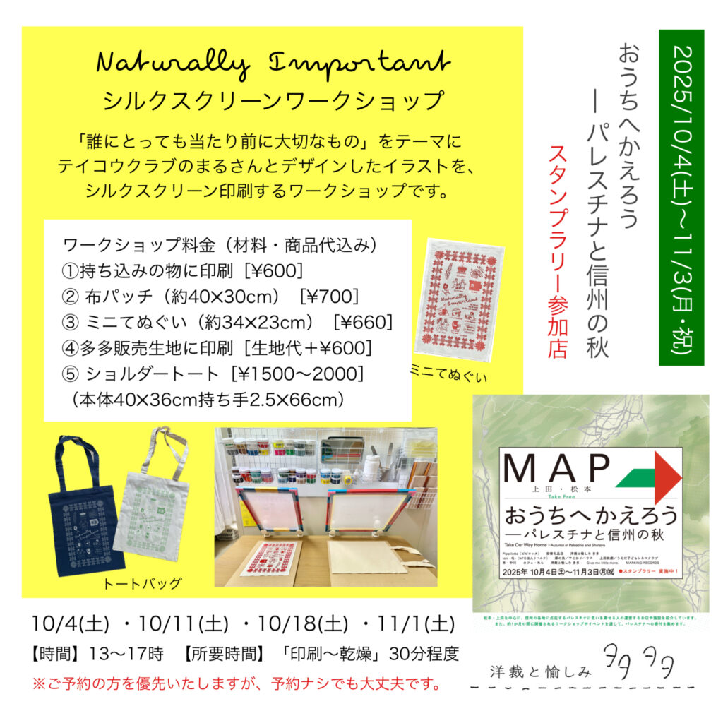 「誰にとっても当たり前に大切なもの」をテーマに、テイコウクラブのまるさん @teikou_club とデザインしたイラスト『Naturally Important』のシルクスクリーンワークショップを開催します。