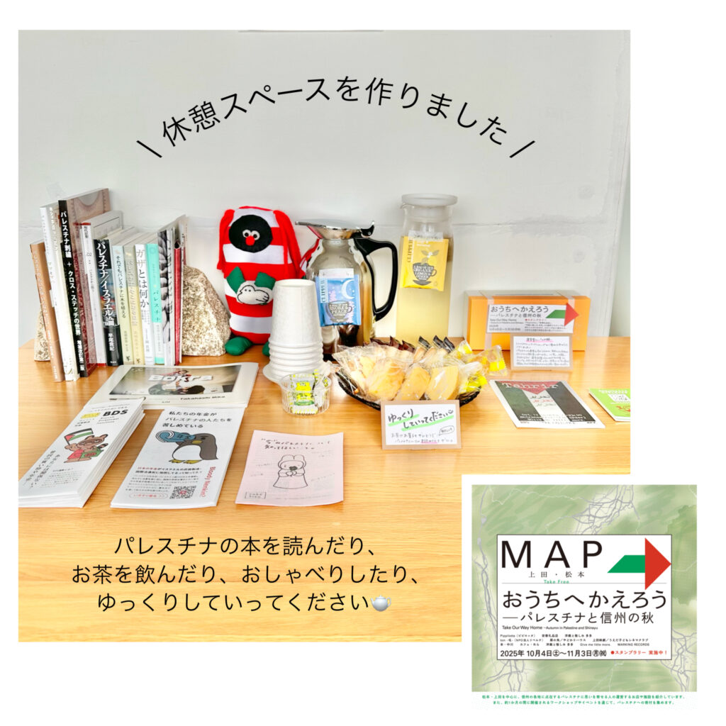 パレスチナについての本やリーフレット、それからお茶やおやつをご用意した無料の休憩スペースもありますので、気軽にご利用くださいね📚🫖
