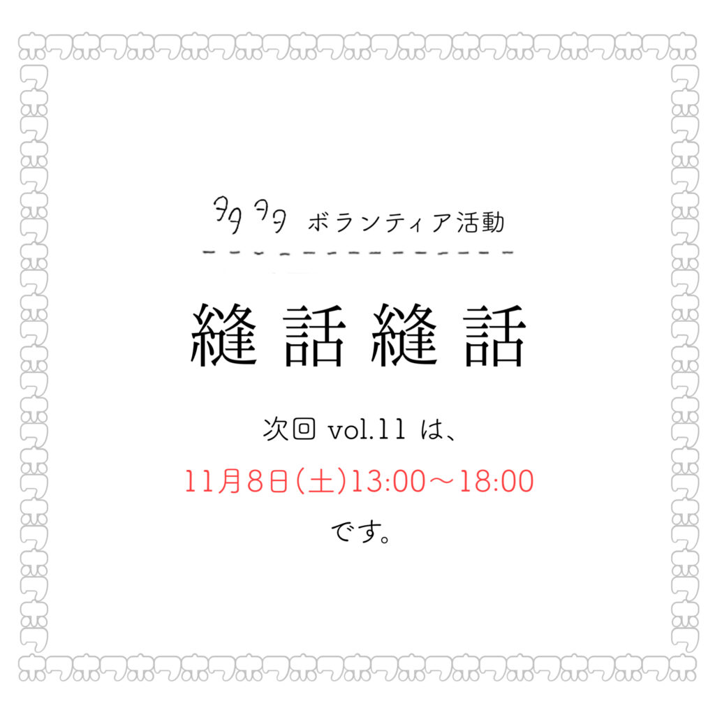 ★今週11/8(土)の午後は、”縫う”ボランティア活動「縫話縫話vol.11」を開催いたします。