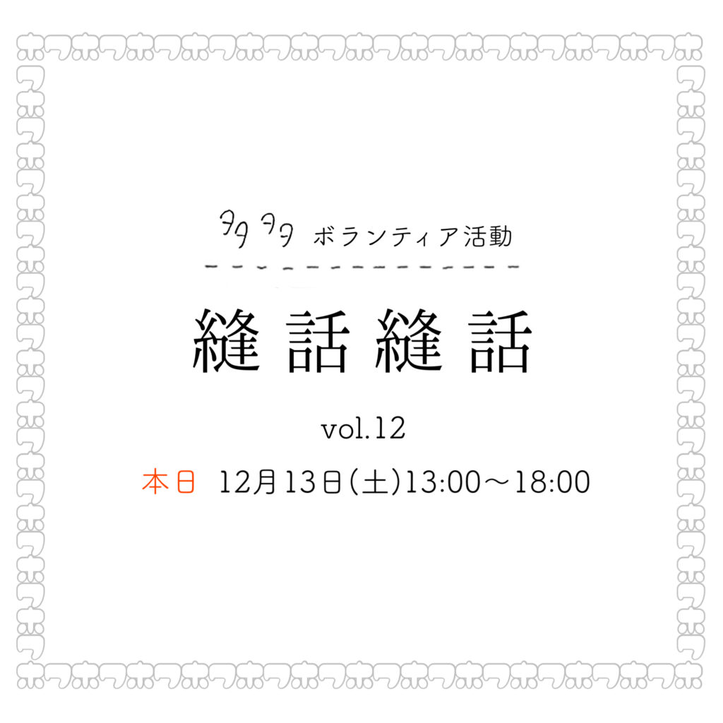 今日の午後13:00〜18:00は、”縫う”ボランティア活動「縫話縫話vol.12」を開催いたします。