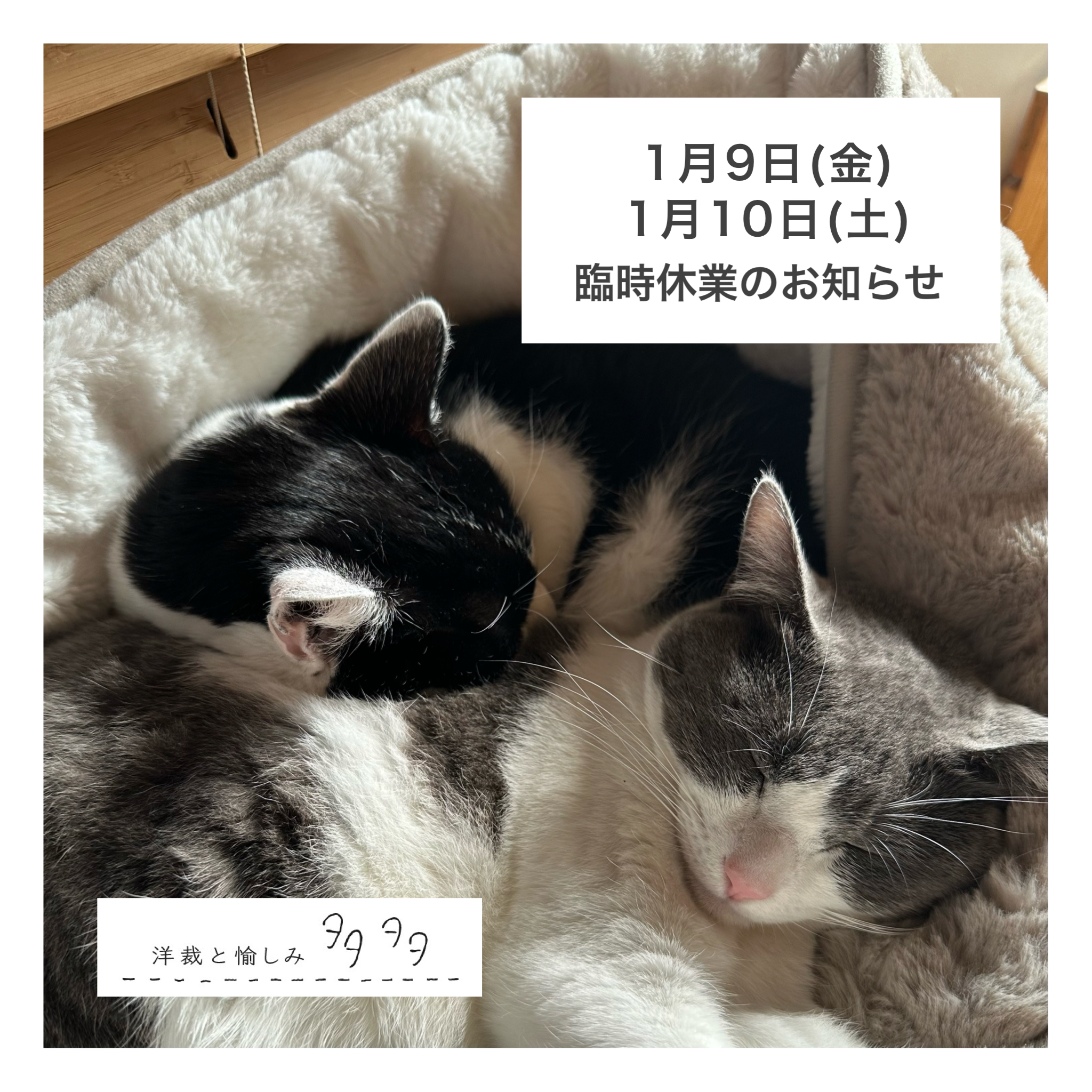 臨時休業延長のお知らせ 2026 1/09 おはようございます。 タオ🦮の術後の見守りが引き続き必要なため、本日1月9日(金)と明日1月10日(土)も臨時休業させていただきます。 連日の変更となり申し訳ありません。 定休日明けの1/13(火)より、またよろしくお願いいたします。 多多日記 家族 日々のこと 臨時休業のお知らせ 福招き この記事を書いたひと 店主 松井 多多店主。 犬猫家族6匹と家人と、安曇野で暮らしています。 この著者の記事一覧へ