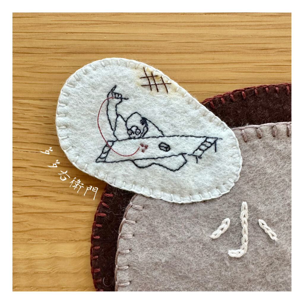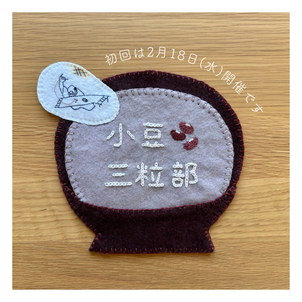 お店の入り口に出す看板を作ろうと、カオリさんに文字の刺繍をお願いしたら、生き生きと小豆三粒の刺繍をする多多右衛門(たたえもん。命名カオリさん🪡)も刺繍で描いてきてくれました。