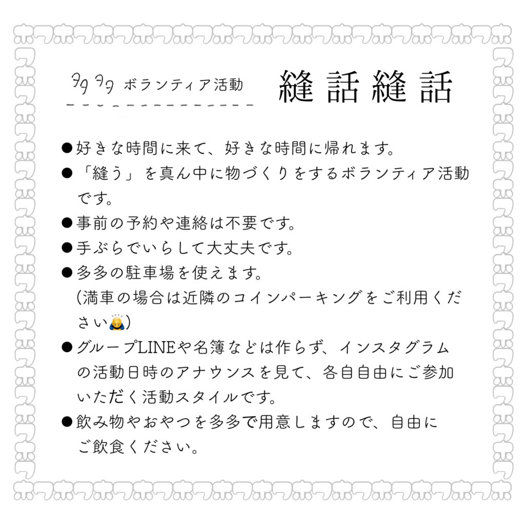 今日の午後13:00〜18:00は、アトリエにて”縫う”ボランティア活動「縫話縫話vol.13」を開催いたします。