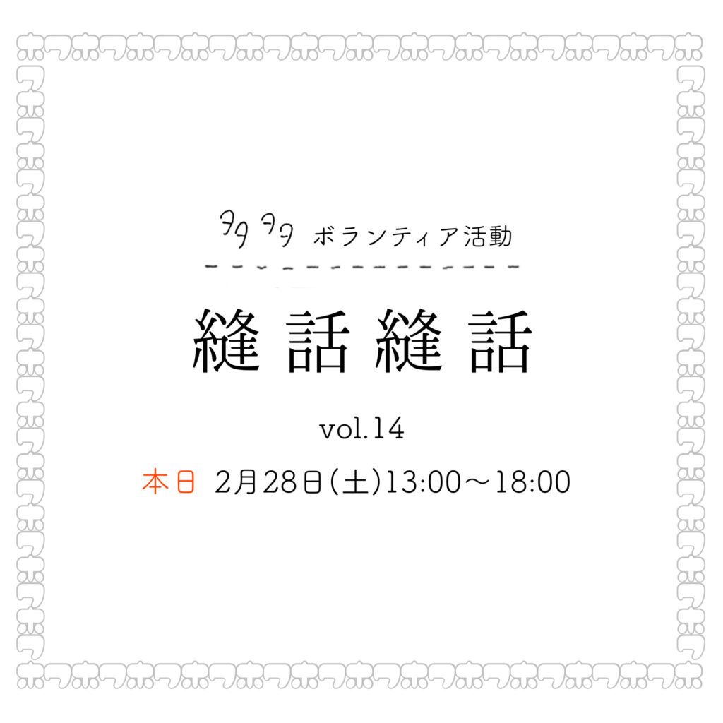 今日の午後はアトリエにて、縫うボランティア活動「縫話縫話vol.14」を開催いたします。