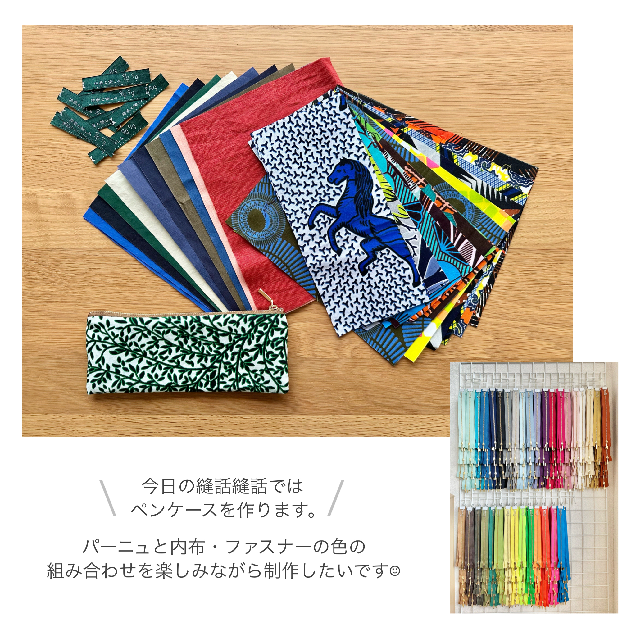パーニュと、内布やファスナーの色柄の組み合わせを楽しみながら作りたいと思います。