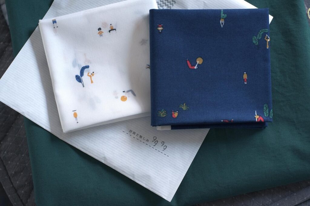 カットクロスはハンカチとマスク用、グリーンの生地は親子お揃いのパンツにと。