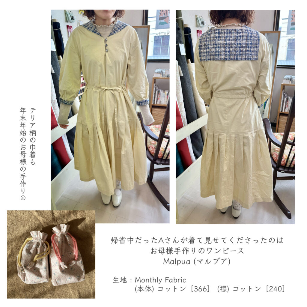 昨年11月22日にご紹介した、ニガム幸子さんのワンピース。 お母様のNさんが作られたそのワンピースを着て、年末に長野へ帰省されていたAさんが多多へいらしてくださいま... -