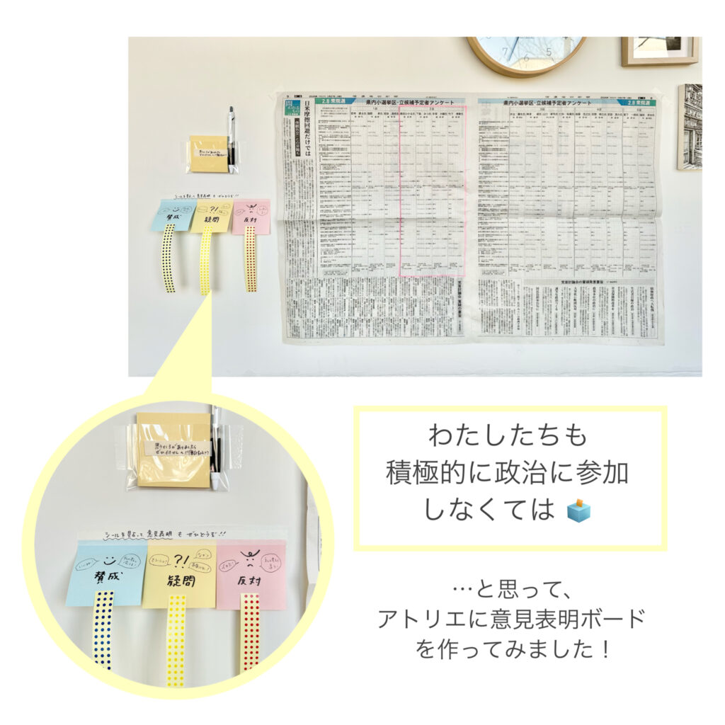 アトリエの壁に、今日公示された衆院選についての意見表明ボードを作ってみました。 誰かの意見に触れると、自分の考えもより明確に浮かび上がるかもしれません。 お時... -